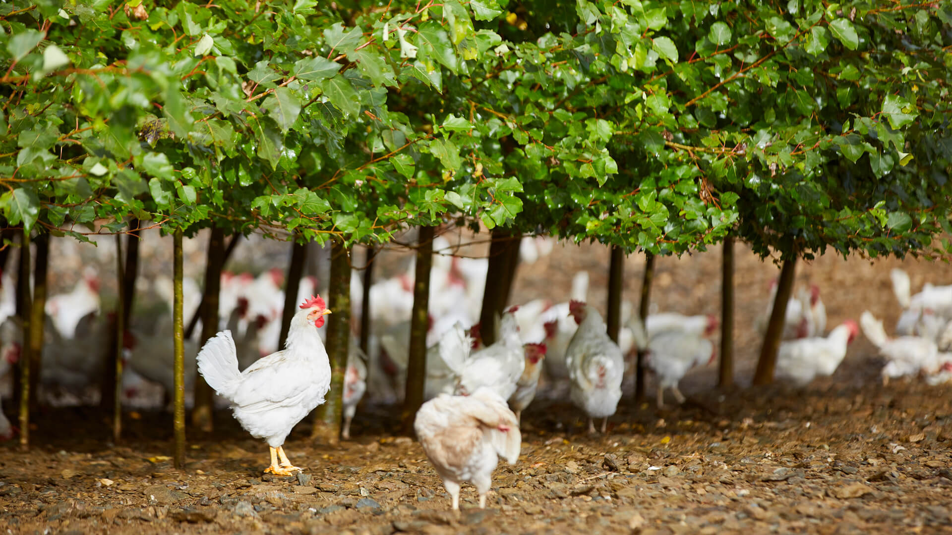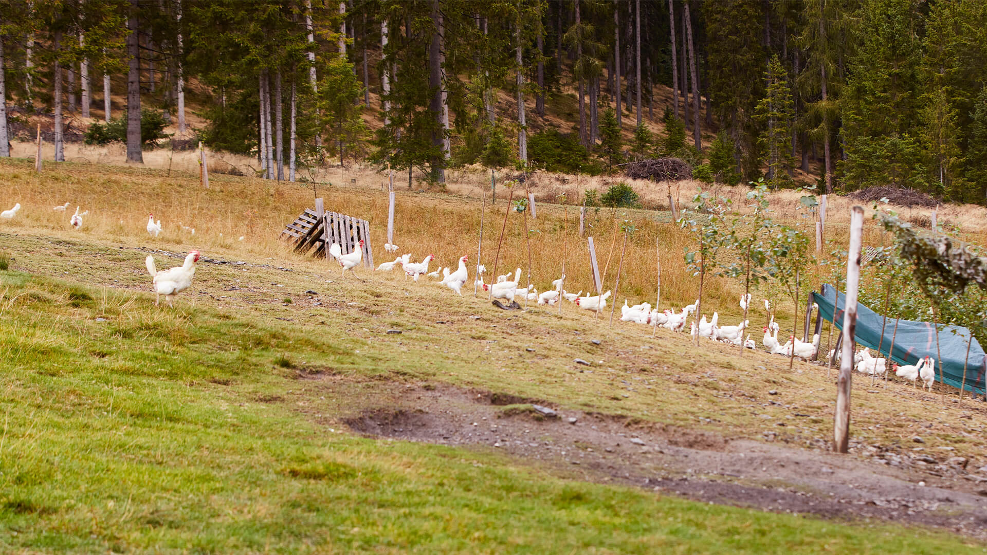 Die Legehennen leben in naturnaher Umgebung und haben ausreichend Platz sowie Auslauf.