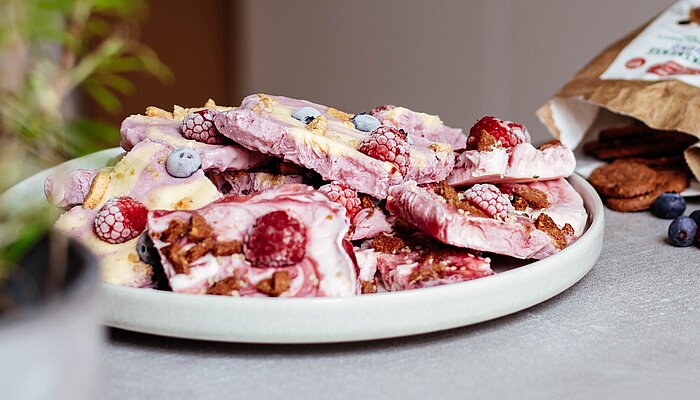 - Bio-Himbeerpüree aus Österreich, Belgien, Spanien, Serbien, Chile, Bulgarien oder Polen (Kontrollstelle: Biokont, Kontrollstellennr.: CZ-BIO-003).