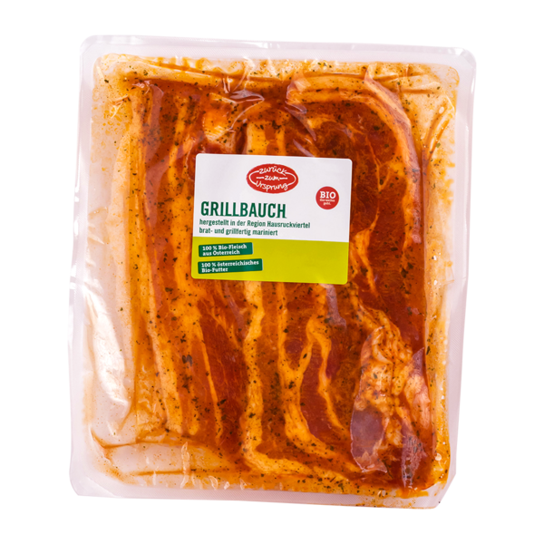brat- und grillfertig mariniertnur solange der Vorrat reichtSo schmeckt die Grillsaison: Wer fettreiches Grillfleisch liebt, liegt mit dem durchzogenen Bio-Grillbauch genau richtig. Zur Herstellung wird nur das beste Bio-Fleisch der Schweine unserer Bio-Bäuer:innen verwendet.