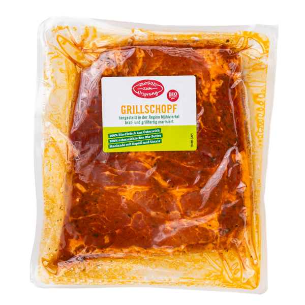 brat- und grillfertig mariniertnur solange der Vorrat reichtDer Grillschopf von Zurück zum Ursprung stammt aus dem Nacken, ist durchzogen und eignet sich daher ausgezeichnet zum Braten und Grillen. Das Fett verleiht ihm seinen hervorragenden Geschmack. Nur das beste Bio-Schweinefleisch wird für unser brat- & grillfertig mariniertes Grillfleisch verwendet.