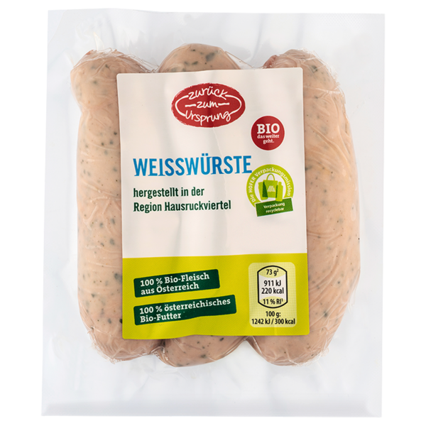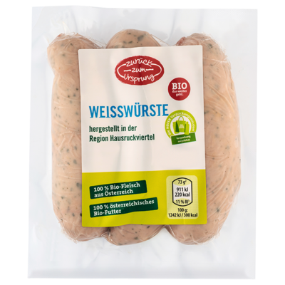 240gnur solange der Vorrat reichtPassend zur Saison sind unsere Zurück zum Ursprung Bio-Weisswürstel aus heimischem Bio-Schweine- und Rindfleisch wieder erhältlich. Sie werden in Österreich nach einer traditionellen Rezeptur und ganz ohne Pökelsalz hergestellt.