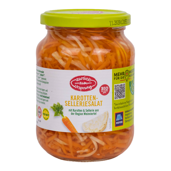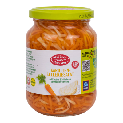 330gUnser Zurück zum UrsprungBio-Karotten-Selleriesalat wird aus köstlichen Karotten & Knollensellerie aus Österreich hergestellt. Durch das Einlegen der rohen Karotten und des Selleries in heimischem Bio-Weingeistessig, bleibt das Gemüse knackig.