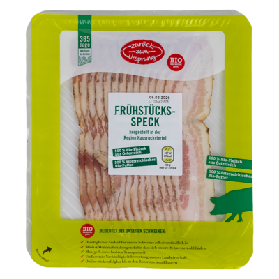90gaufgeschnittenWie sein Name schon verrät, ist der Zurück zum Ursprung BIO-Frühstücksspeck perfekt für das Frühstück geeignet. Seine milde Würzung passt zu Frühstücks-Variationen jeglicher herzhaften Art. Besonders gut lassen sich daraus herrlich knusprige Speckstreifen zaubern.