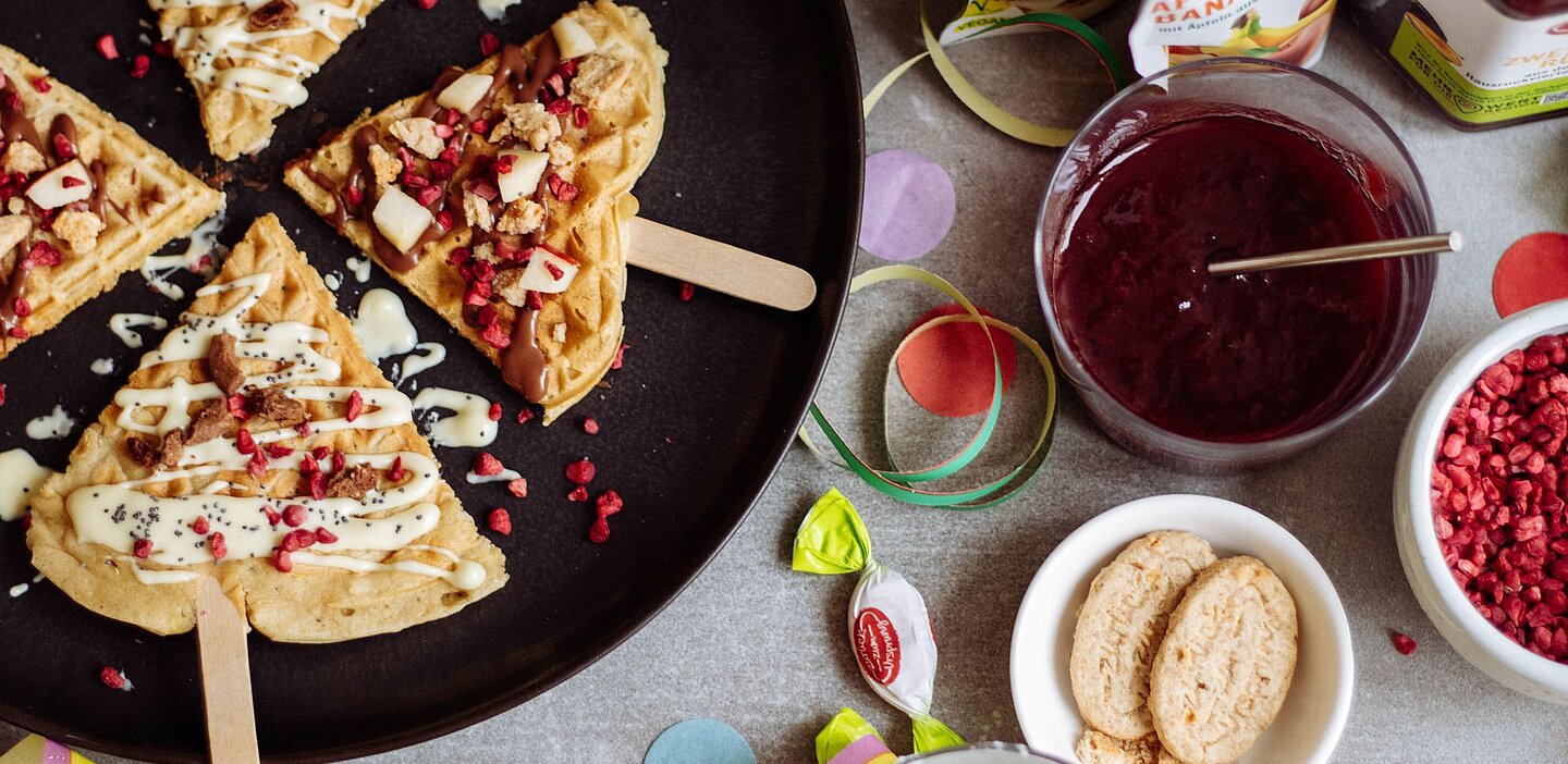 Die Waffeln am Stiel gemeinsam mit Joghurt oder einem fruchtigen Röster als Dip servieren und genießen.