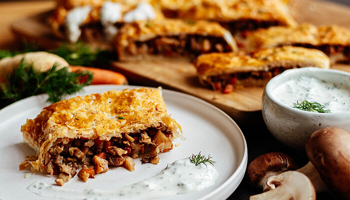 Die gefüllte Teigrolle in ca. 3 cm dicke Stücke schneiden und Schnecken in einer gefetteten Backofenform (rund oder eckig) schlichten. Backform auf die mittlere Schiene des vorgeheizten Ofens geben und ca. 25-30 Minuten goldbraun backen.