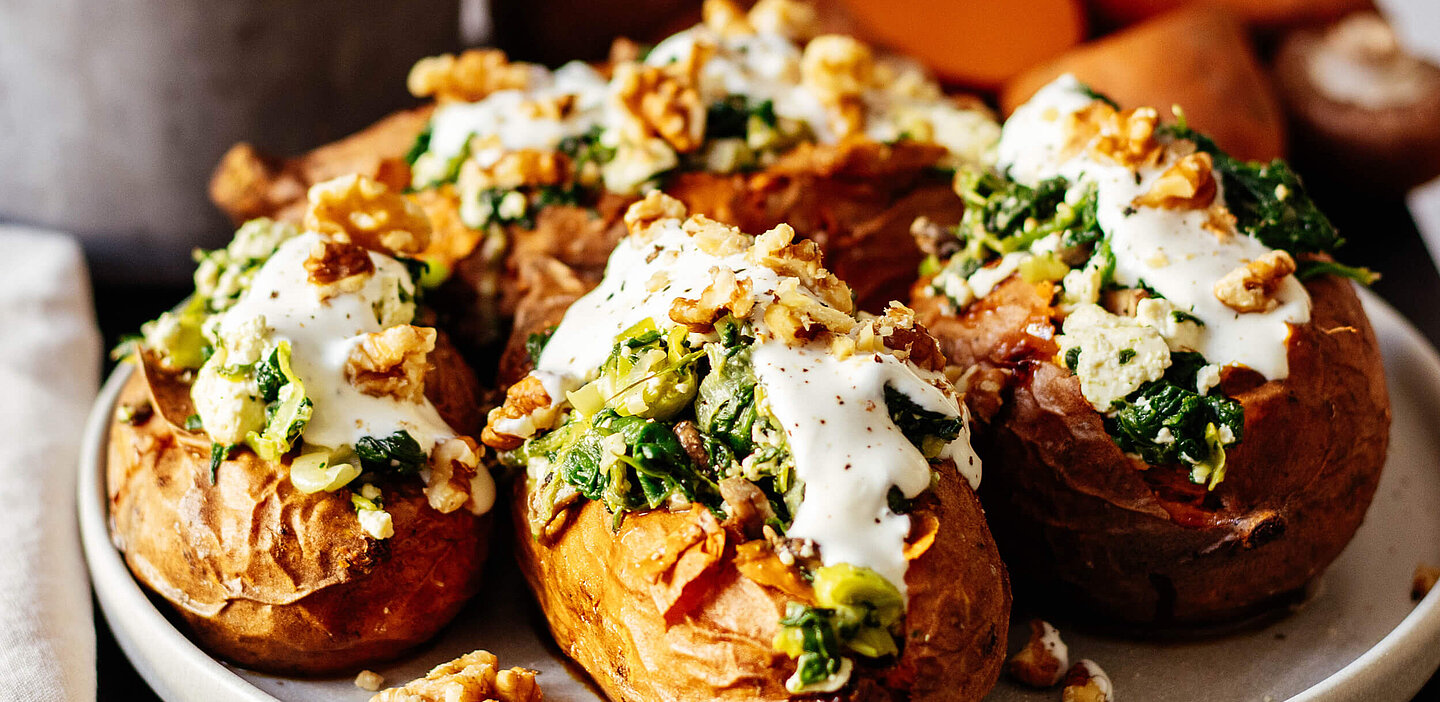 Süßkartoffeln füllen: Vorgebackene Süßkartoffeln aus dem Rohr nehmen und kurz abkühlen lassen. Süßkartoffeln der Länge nach einschneiden und die Gemüse-Mischung großzügig in die Süßkartoffeln füllen. Anschließend mit Schaf Topfen Creme und Nüssen toppen und warm servieren.