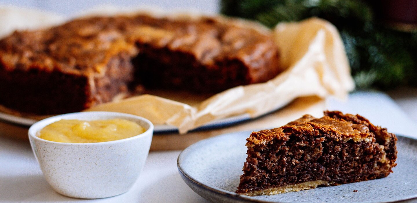 Eier aufschlagen, nach und nach zur Butter-Apfelmus-Mischung geben und gut unterrühren. Sauerrahm einrühren, bis eine gleichmäßige Masse entsteht. Die Mehlmischung dazugeben und alles zu einem glatten Teig verarbeiten.