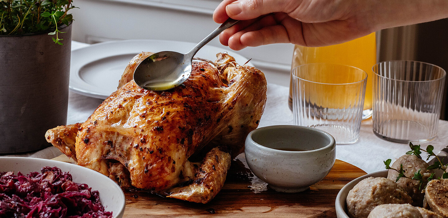 Zum Schluss das Rotkraut erhitzen, gewürfelte Birnen kurz mitköcheln lassen und warm halten. Das Hendl tranchieren, mit Brotknödeln und Rotkraut auf Tellern anrichten und mit Bratensaft servieren.
